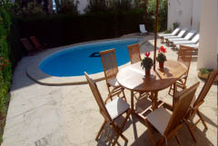 Die Wohnungen haben ein Schwimmbad mit Liegestühlen und eine Dusche.